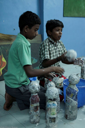 Conception, création d’une parade de marionnettes dans le bidonville de Chenai, Inde. Partie sans outils ni matériaux, comment s’inspirer et puiser dans la culture locale pour embarquer les enfants dans la fabrication et la manipulation d’objets au service d’une fête partagée…